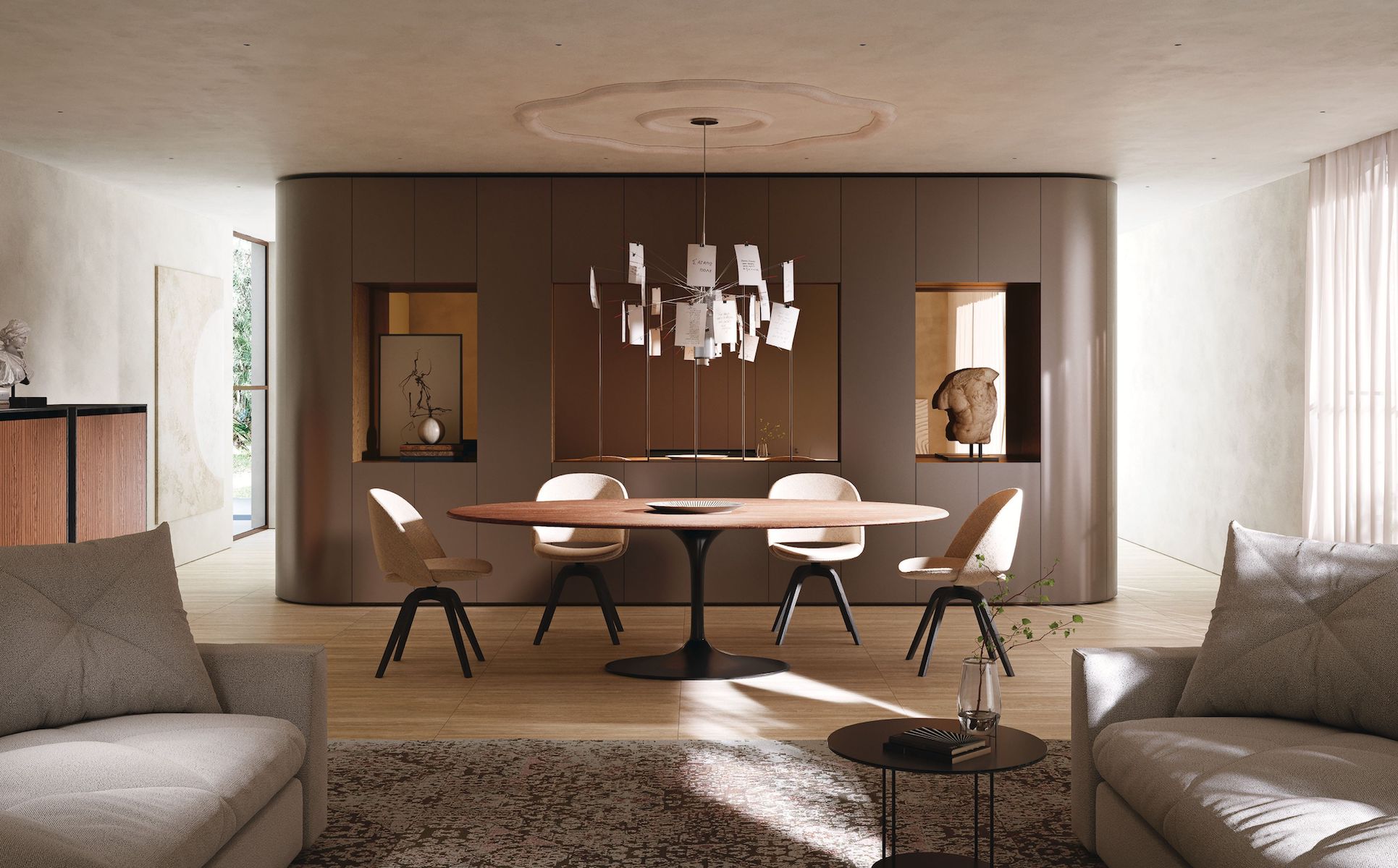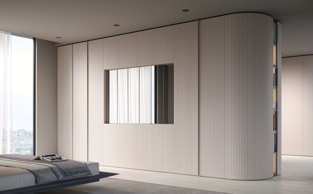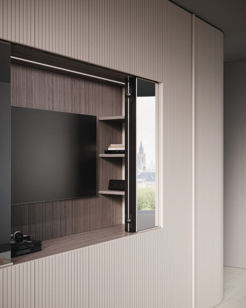 The doors with 180° compact opening can be in wood, SLOT wood or with mirrored glass and combine practicality and elegance.