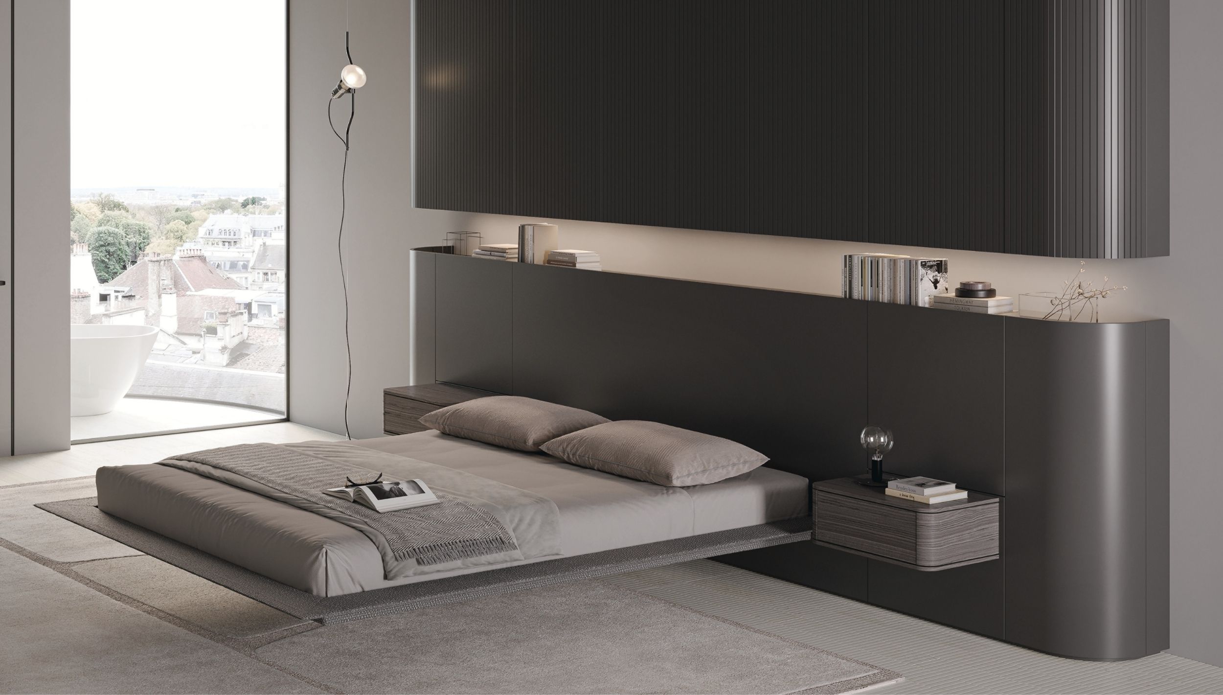 WIND is a system of storage headboards that also includes dedicated suspended bedside tables.