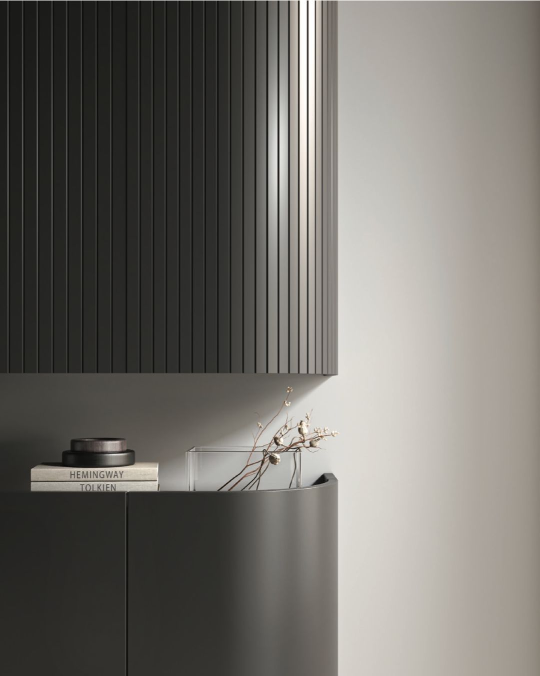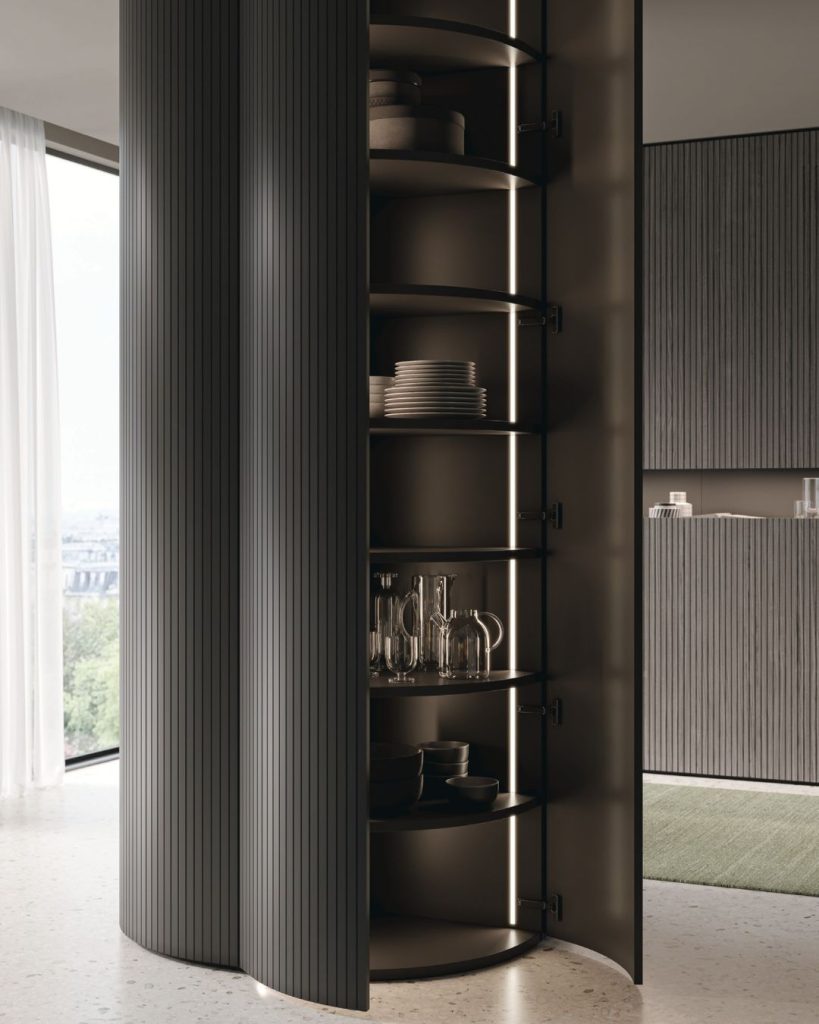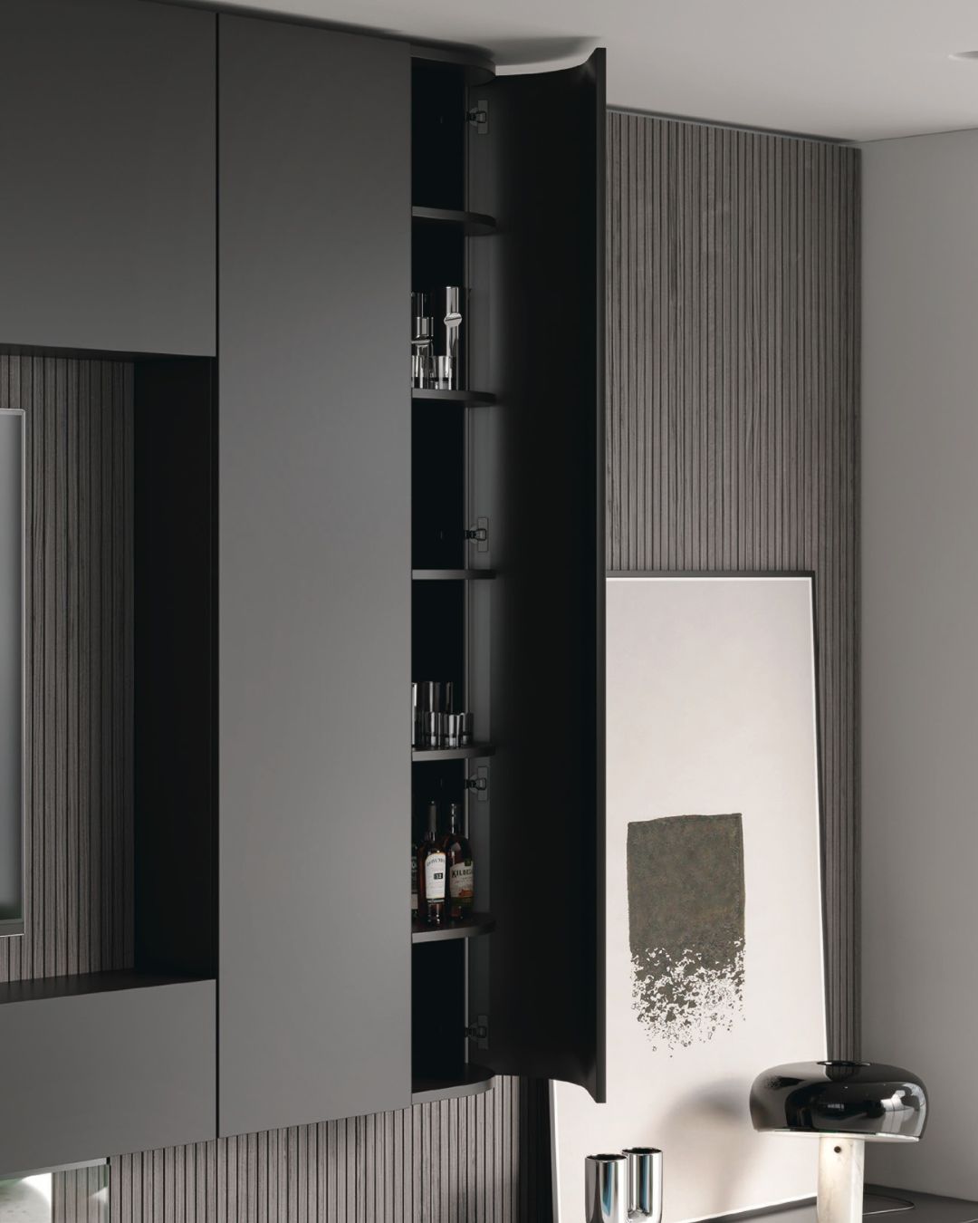 L’Elemento Circle trasforma l’angolo in un punto focale, avvolgendo l’ambiente con volumi pieni e superfici continue. L’apertura laterale cela nicchie e librerie, suggerendo un’idea di contenimento discreto ma di forte impatto visivo. Disponibile in diverse finiture, integra estetica e funzionalità.