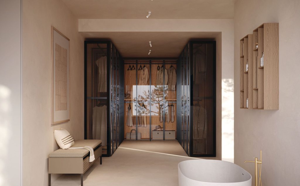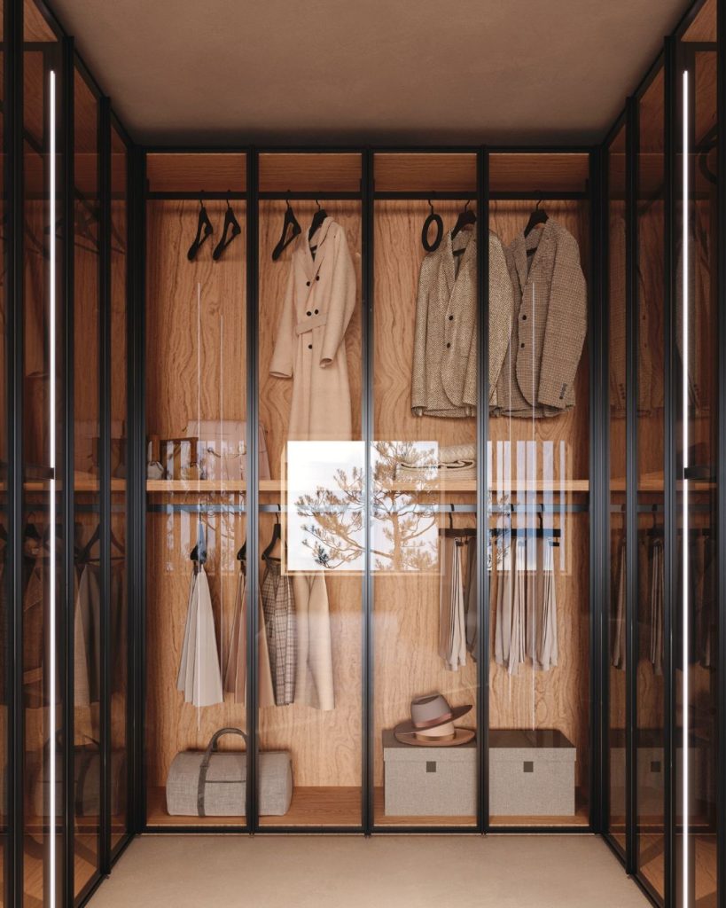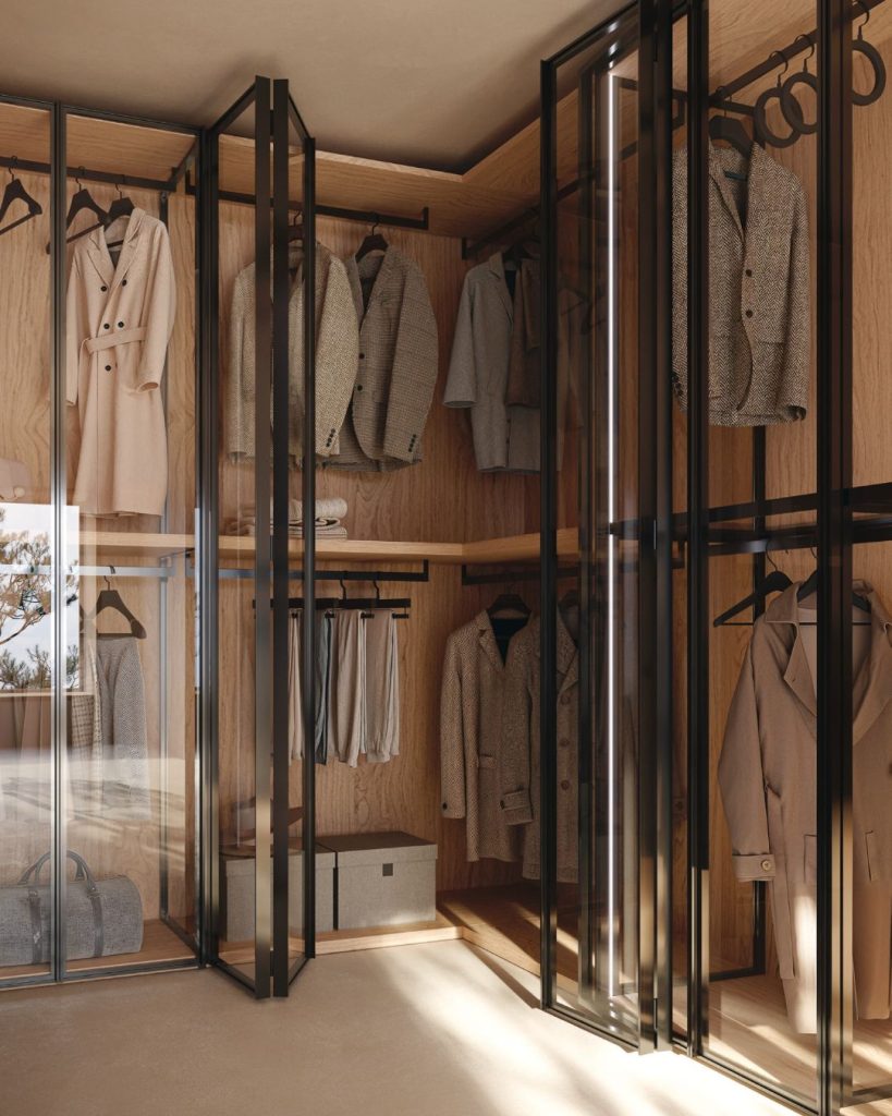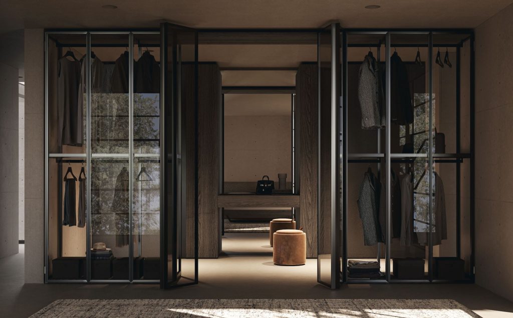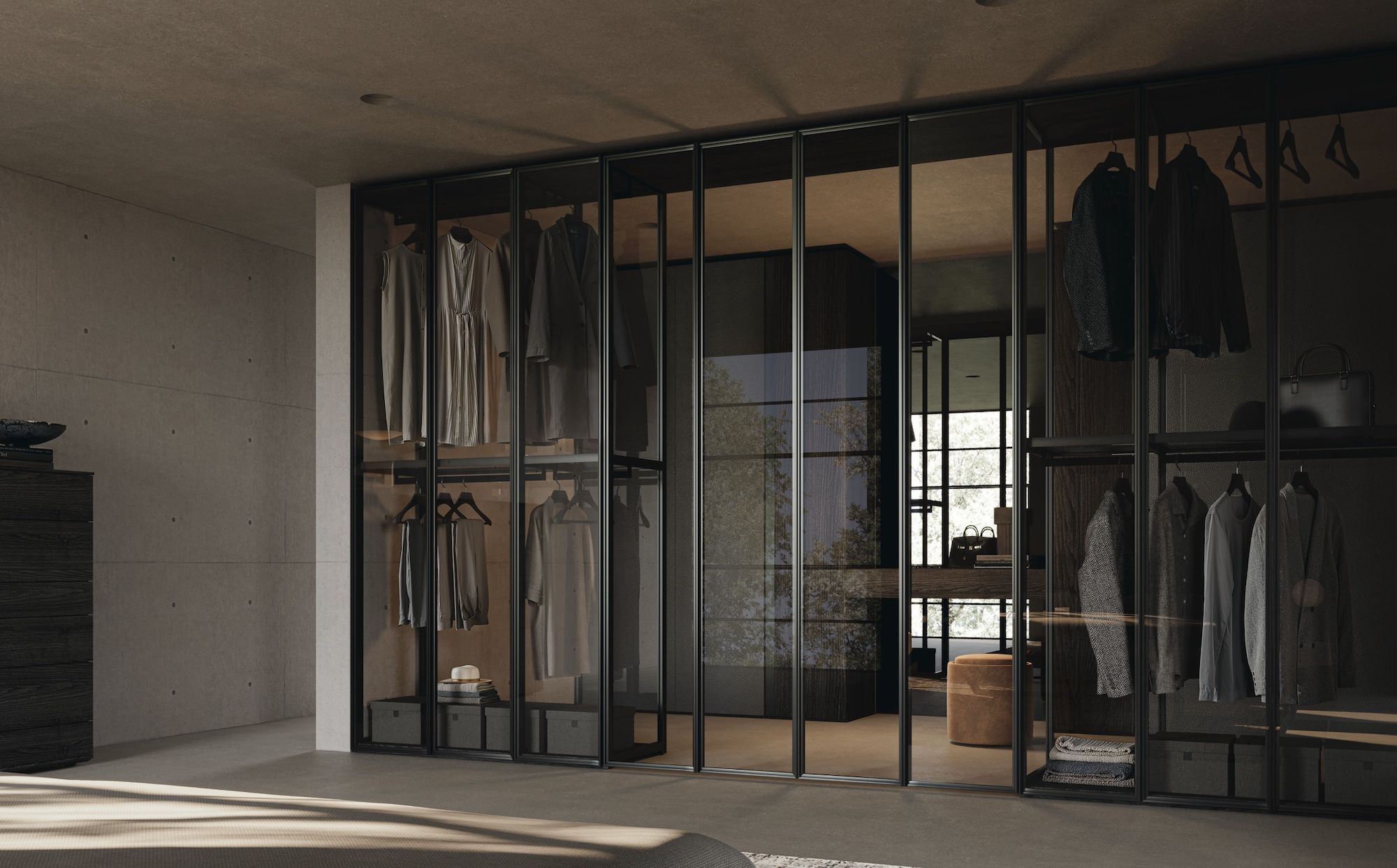 Telaio e vetro i protagonisti di questo sistema che conferisce leggerezza ed eleganza reinterpretando il concetto di armadio, con la trasparenza di una vetrina.