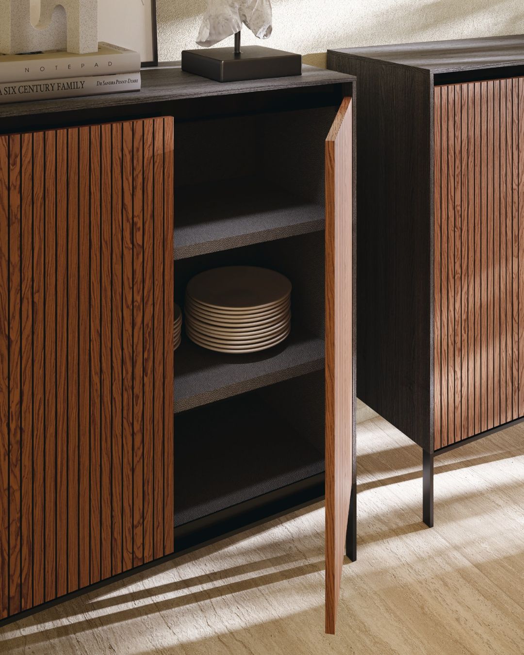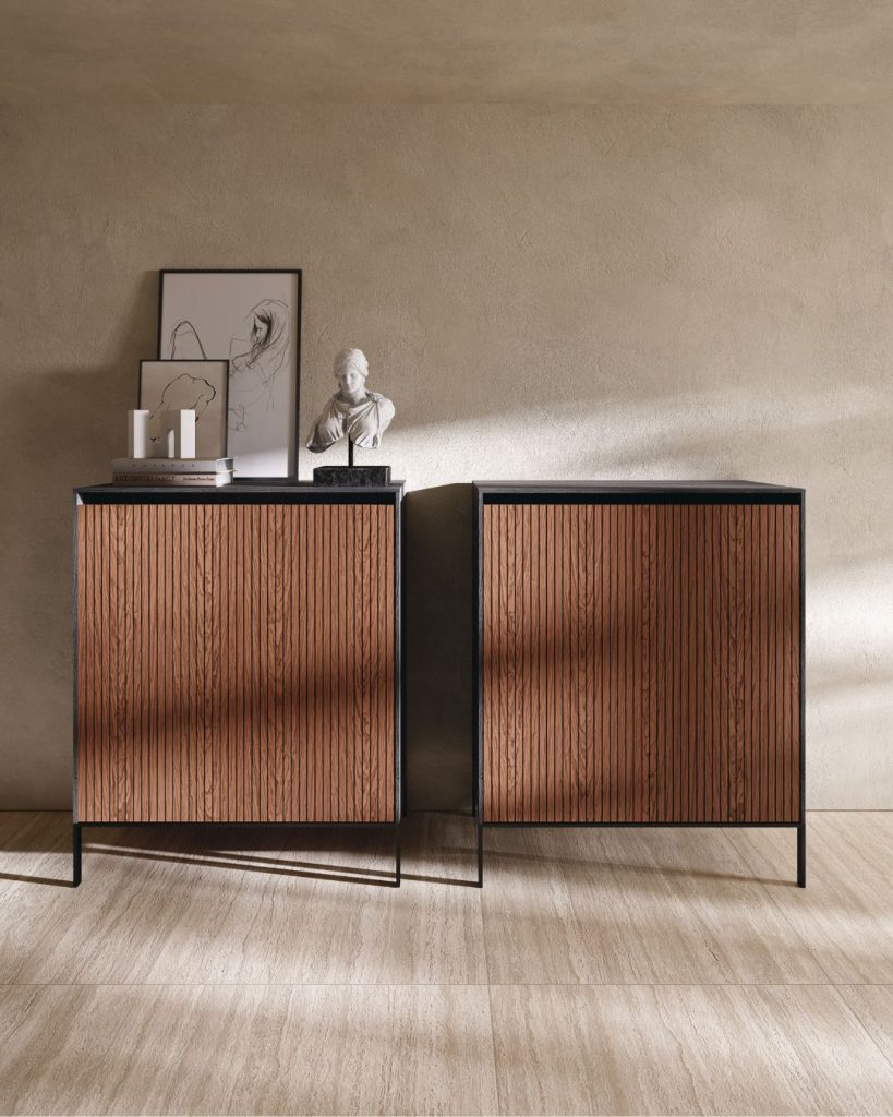 La madia moderna Keen si abbina con disinvoltura ad arredamenti di stile sia classico che moderno grazie al suo design minimal. Perfetta fusione tra contenuto e contenitore, grazie alla sua duttilità e alla personalizzazione delle superfici disponibili in legno impiallacciato, laccato, e laminato, ha inoltre la possibilità di essere personalizzata con tutte le finiture disponibili nella collezione Vetro di Tumidei.