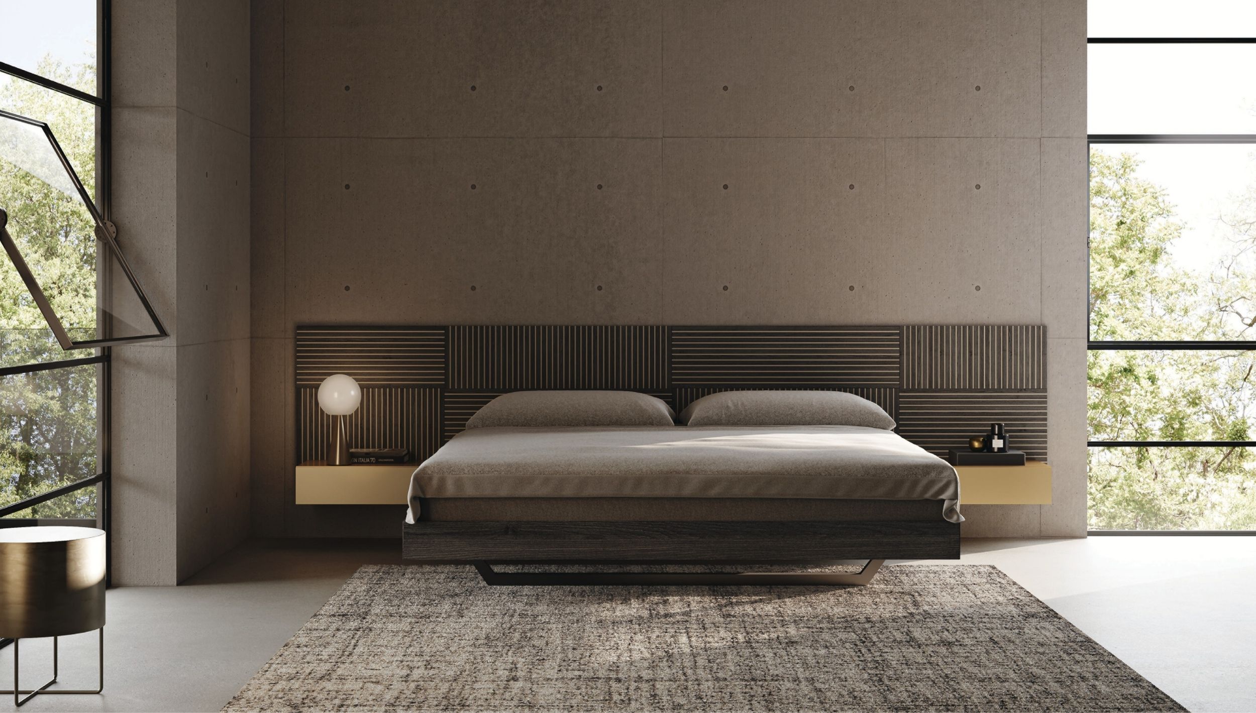 La testiera, caratterizzata da una trama verticale e orizzontale, dialoga con la luce integrata per creare un’atmosfera intima e accogliente. Le linee pulite e i volumi essenziali accentuano la leggerezza della struttura, mentre i comodini sospesi completano una composizione elegante.
