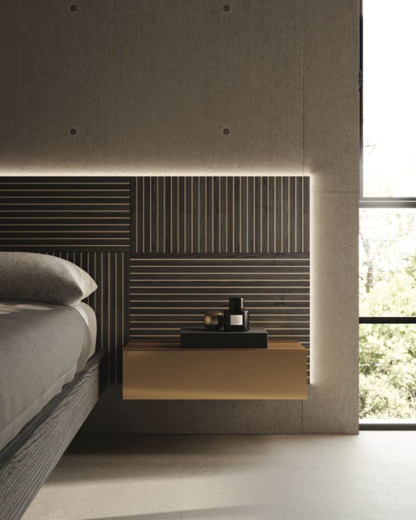 La testiera, caratterizzata da una trama verticale e orizzontale, dialoga con la luce integrata per creare un’atmosfera intima e accogliente. Le linee pulite e i volumi essenziali accentuano la leggerezza della struttura, mentre i comodini sospesi completano una composizione elegante.