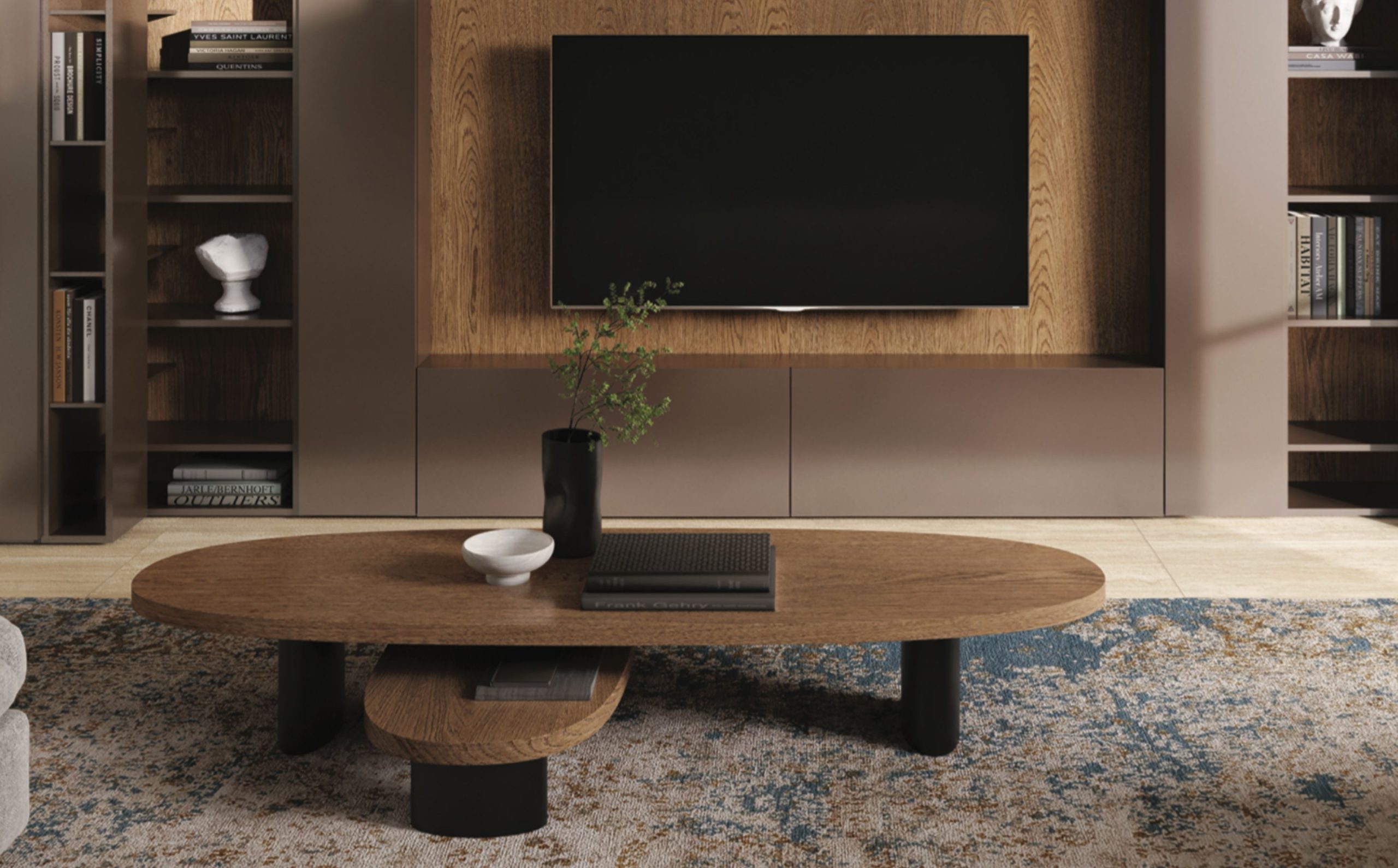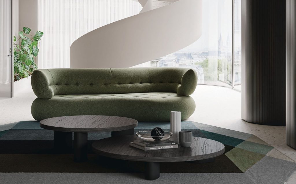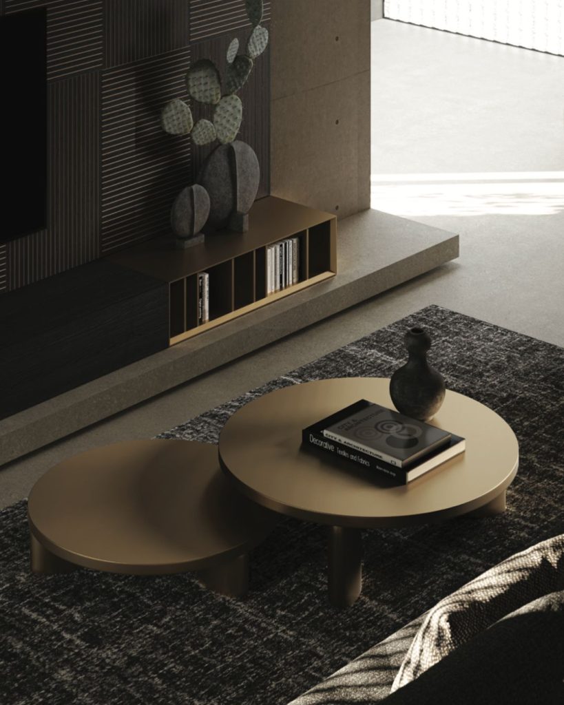 I tavolini dalle forme tonde ed ellittiche con appoggi di 2 altezze diverse permettono suggestivi giochi di compenetrazione.